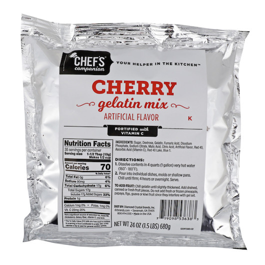 Chefs Companion Cherry Flavored Gelatin Mix is a case-packed food item for grocery shelves, foodservice kitchens, cafeterias, restaurants, office pantries, and convenience programs.