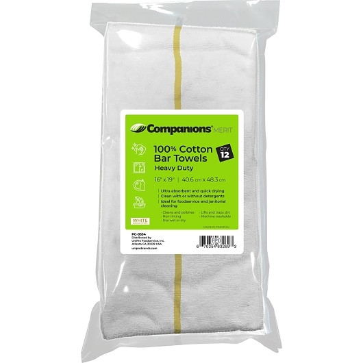 Companions White With Gold Stripe Heavy Duty Bar Towels is a foodservice wiping towel for sanitation stations, prep areas, service counters, and facility cleanup programs.