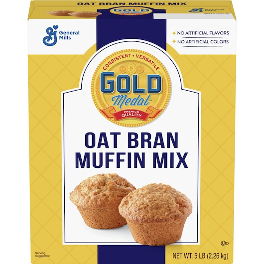 Description Gold Medal Oat Bran Muffin Mix, 5 Pounds Per Pack, 6 Per Case The General Mills Gold Medal Oat Bran Muffin Mix is great for making delicious, soft muffins in no time. All this easy-to-use, oat bran muffin mix requires is water, saving time and labor. The batter can be mixed with chocolate chips, berries, and nuts among other additional ingredients. FEATURES Easy-to-use oat bran muffin mix Contains wheat, eggs, milk and soy 0 g trans fat Delivers consistent taste and texture Add-water muffin mix Kosher Dairy certified Shelf life: 372 days 5 lb. (2.26 kg) each 6 packs per case PREPARATION : Bake – Standard Prep: Just Add Water. One Stage Mix With 40 Seconds Of Mixing Time. Scoop Batter Into Paper Lined Or Greased Muffin Pans. Bake Time 15-18 Minutes In 375 Degrees F Convection Oven. See Package For Complete Mixing And Baking Instructions. STORAGE : 6–5 Lb. Boxes Of Mix Per Case. Best If Used By Code Date. Store In A Cool, Dry Location. INGREDIENTS : Enriched Flour Bleached (Wheat Flour, Niacin, Iron, Thiamin Mononitrate, Riboflavin, Folic Acid), Sugar, Oat Bran, Palm Oil, Whole Grain Oats. Contains 2% Or Less Of: Modified Corn Starch, Leavening (Sodium Acid Pyrophosphate, Baking Soda, Monocalcium Phosphate), Dextrose, Salt, Mono And Diglycerides, Modified Whey, Cinnamon, Xanthan Gum, Egg, Soy Flour.