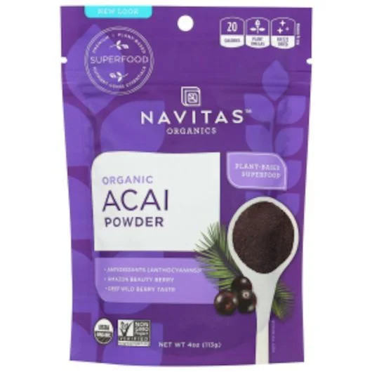 Description Acai: The legendary Brazilian superberry! Navitas Organics Acai Powder is organic and freeze-dried for maximum nutrition and ease of use. Blends perfectly into your smoothies, oatmeal, baking and dessert recipes. Great for keto and paleo diets! Revered for its skin-supportive properties, acai is a fantastic source of fiber and antioxidants. It also contains omega-3 and omega-6 fatty acids — nutritional powerhouses that reduce inflammation in the body and are necessary for daily functioning. Committed to accuracy and transparency, we third party test all products to verify quality and nutritional values. Navitas Organics: On a mission to create a healthier world through regenerative organic farming and plant-focused lifestyles. Join us! USDA Organic Non-GMO, Kosher, vegan, gluten-free. 4 oz. (113.4 g) each 12 per case