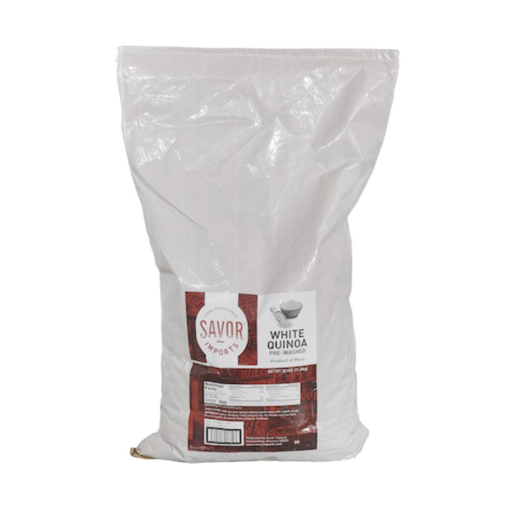 Description The Savor Imports White Quinoa is ideal for breakfast or main dishes. It is a good source of fiber and protein. This pre-washed, all-natural quinoa is certified kosher. The bulk pack of 25 pounds is suitable for restaurants, bistros, and cafeterias. White quinoa All-natural quinoa Pre-washed to save prep time Good source of fiber and protein OU Kosher certified 25 lb. (11.34 kg) total weight