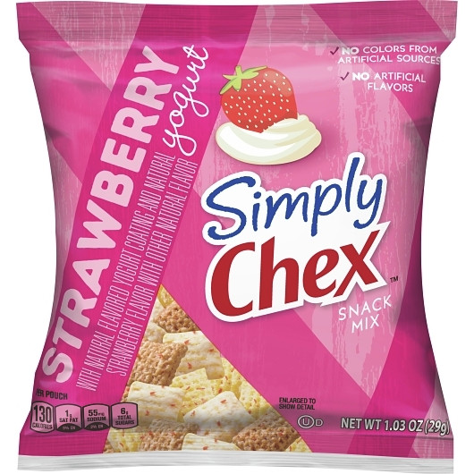 Description The Simply Chex Strawberry Yogurt Snack Mix makes for a delicious ready-to-eat snack. Made with whole grains, this snack mix includes cereal pieces flavored with strawberry and yogurt. Free from gluten and lower in fat than regular potato chips, the Simply Chex snack mix will be ideal for kids and outdoor menus. The bulk case will be a great buy for convenience stores, concession stands, and supermarkets. Strawberry and yogurt cereal pieces snack mix Single-serve pouches to retain freshness 0 g trans fat 0 mg cholesterol Contains milk, soy, and wheat No added artificial flavor or color No high-fructose corn syrup Gluten free OU Kosher Dairy certified CN labeled USDA Smart Snacks compliant CACFP eligible 1.03 oz. (29.20 g) each 60 packs per case
