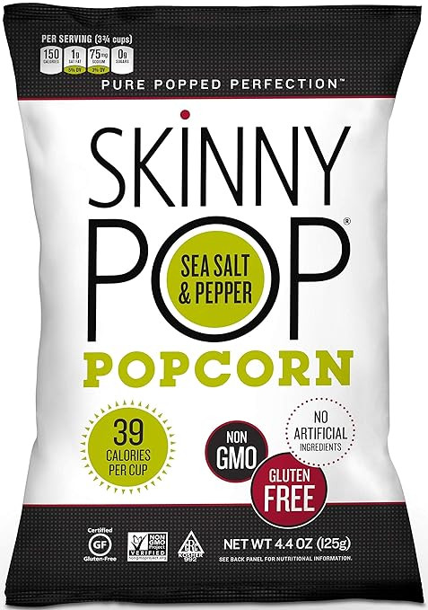 Description The SkinnyPop Sea Salt and Pepper Popcorn is a tasty grab-and-go snack option suitable for all age groups. this popcorn is flavored with black pepper and sea salt for added taste. Fortified with fiber, this gluten-free popcorn is healthy. Available in 12 easy-to-open bags, the SkinnyPop sea salt and pepper popcorn bulk pack will be great for school cafeterias, concession stands, and retail stores. Ready-to-eat popcorn Flavored with black pepper and sea salt Good source of fiber 0 g trans fat 0 mg cholesterol No preservatives No added artificial flavor No artificial ingredients Dairy, peanuts, and tree nut free Vegan Gluten free Whole Grain Council certified Non-GMO Project verified