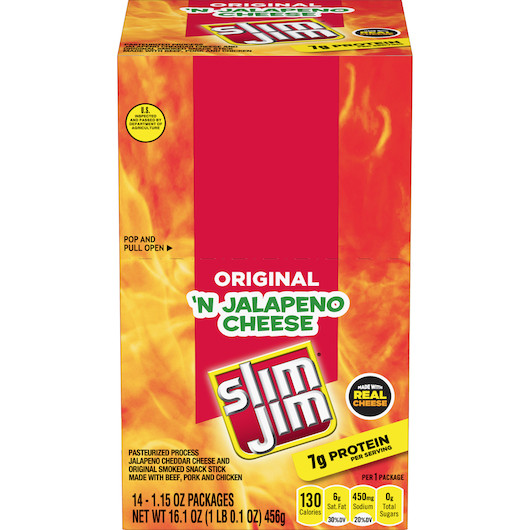 Description Slim Jim Original N Jalapeño Cheese Beef Snack Stick – 1.15 oz – 14-Count – 6-Pack Case – High-Protein Snack Duo Enjoy the bold combination of classic Slim Jim beef stick flavor with the spicy kick of jalapeño cheese . Each dual snack pack features a ready-to-eat meat and cheese pairing , offering 7 grams of protein to curb hunger anytime, anywhere. Made with real ingredients and USDA inspected , these individually wrapped snack sticks are great for lunchboxes, road trips, or stocking up. With 14 packs per unit and 6 units per case , they’re ideal for resale, vending machines, or high-volume snack storage. Includes Slim Jim Original beef stick paired with spicy jalapeño cheese 7g protein per serving – satisfying, high-protein snack Made with real cheese and USDA-inspected meat Ready to eat , shelf-stable and portable Individually wrapped for grab-and-go convenience Each stick: 1.15 oz (32.6 g) 14 dual snack sticks per pack , 6 packs per case