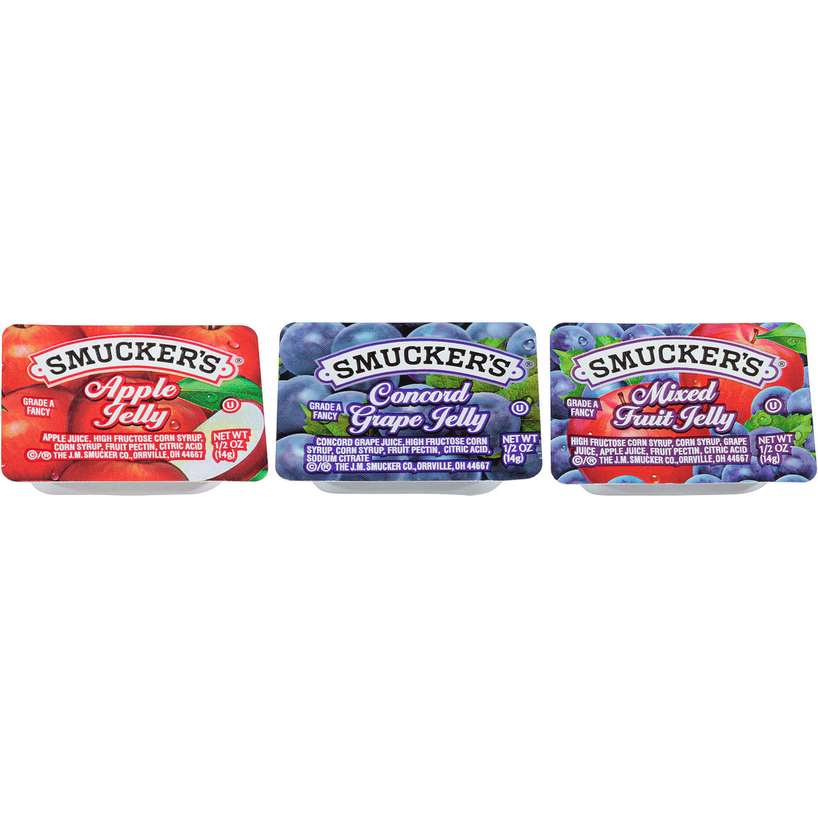 Description The Smucker s Assorted Jelly Cups is a mix of 0.5 ounce of apple, grape and mixed fruit flavored jelly cups. Made from high-quality fruit juice, these jellies are Kosher Pareve certified. The bulk case of these single use jelly cups are ideal for hotels, diners, catering services and cafeterias. Assorted single-serve jelly packs Packed in convenient portion control cups OU Kosher certified 0.5 oz. (14.17 g) each 200 cups per case