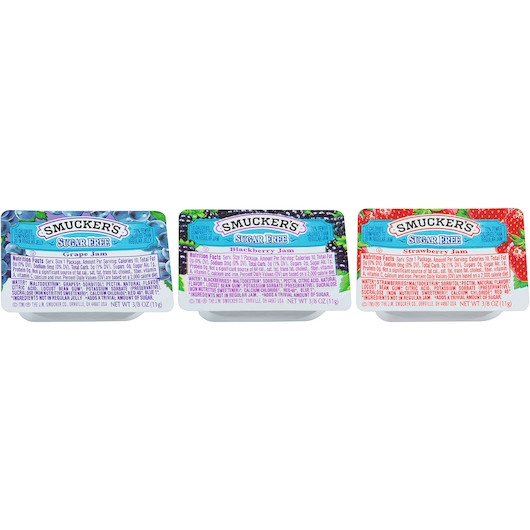 Description Great for meeting a variety of dietary needs, Smucker s Sugar Free Assortment, offers an appealing lineup of popular jams, jellies and preserves made with real fruit and no sugar. This assortment includes Sugar Free Grape, Strawberry, and Blackberry Jam. By offering a selection of portion control flavors from the brand guests know and love, it s easy to satisfy the desire for customization and quality across all dayparts. Assortment includes 120 Sugar Free Grape, 40, Sugar Free Strawberry and 40 Sugar Free Blackberry. For more than a century, the J.M. Smucker Company has been providing families with quality spreads they love both at home and away. An assortment of real fruit flavors meet the demand for variety Creates a customizable experience for guests Each cup is coded for maximum manufacturing traceability Fits a variety of caddy options available for tabletops and buffet lines Kosher Portable and great for off-premise dining Portion control cups eliminate sanitation concerns