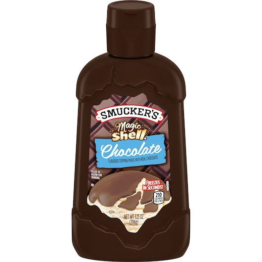 Description The Smuckers Magic Shell Chocolate Topping is made with real chocolate. This topping freezes in seconds to give the hand-dipped chocolate-shell goodness that pairs well with any ice cream flavor. Available in a bulk case of 8 bottles, the Smuckers Magic Shell Chocolate Topping is ideal for supermarkets, convenience stores, and hypermarkets. Chocolate topping Made with real chocolate Freezes in seconds Provides the hand-dipped, chocolate-shell goodness Pairs well with any ice cream flavor 0 g trans fat 0 mg cholesterol Contains milk, soy, and their derivate OU Kosher Dairy certified 7.25 oz. (205.53 g) each 8 bottles per case