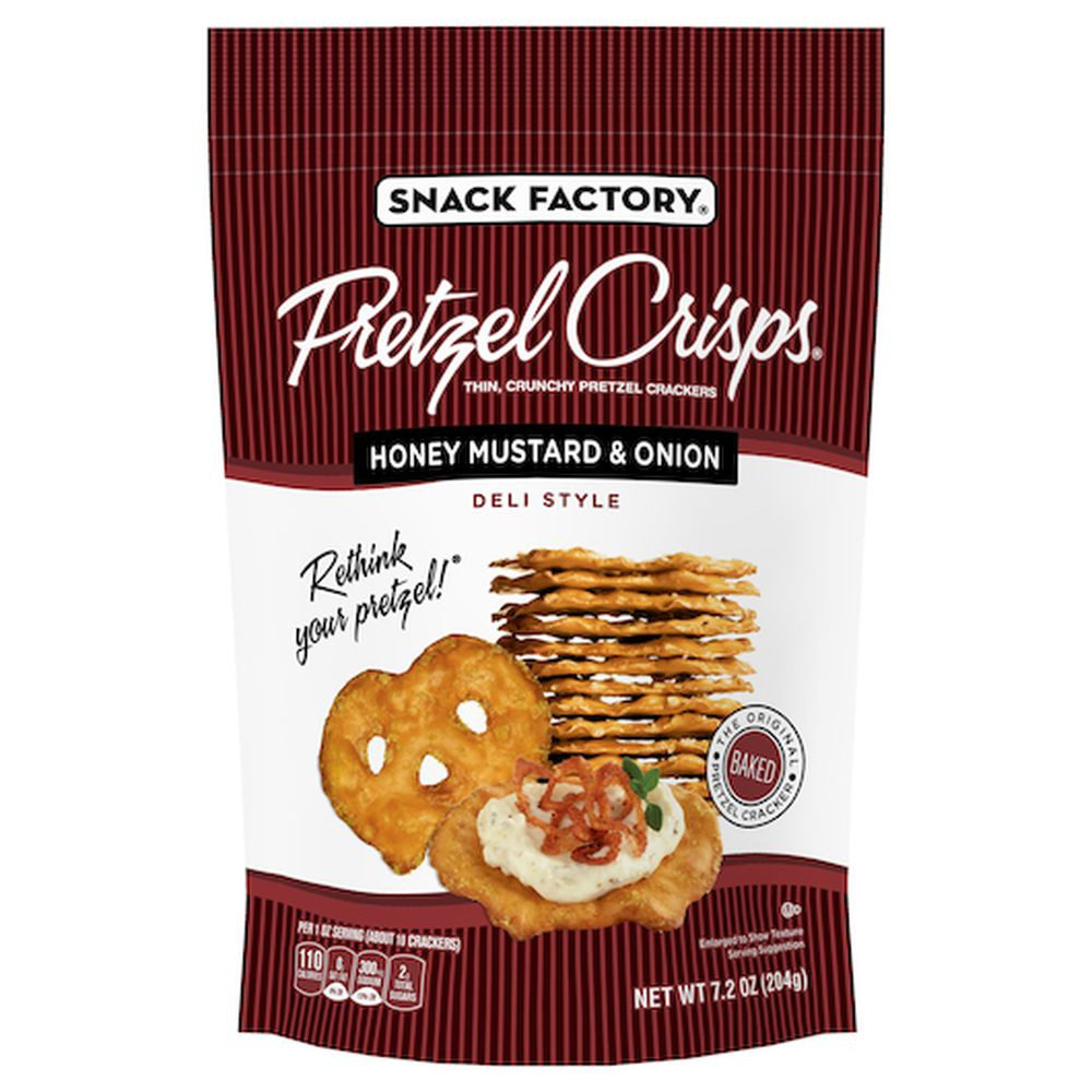 Description Honey Mustard & Onion Pretzel Crisps marries tangy mustard and onion with the irresistible sweetness of honey. Layer your favorite deli lunch meat, a small slice of cheese, mustard and mayo between two Honey Mustard & Onion Pretzel Crisps. Since 2004, Pretzel Crisps have been a modern twist on an old favorite. Pretzel Crisps are the best part of the pretzel – thin and flavorful with the crunch you love. They re dippable, spreadable, and deliciously snackable. With great gourmet taste from wholesome ingredients, it s the perfect snack anytime!