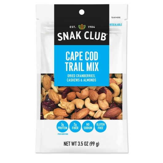Description The Century Snacks Snak Club Premium Pack Cape Cod Trail Mix contains cranberries, cashews, and almonds. It makes a healthy and filling snack option. The bulk case with 6 packs of Century Snacks Snak Club Cape Cod Trail Mix is ideal for snack bars, pantries, and cafeterias. Cape cod trail mix Mix of cranberries, cashews, and almonds Good source of fiber and protein Healthy snack option 0 g trans fat 0 mg cholesterol No added artificial flavors or colors No preservatives Gluten free OU Kosher certified Non-GMO Project verified 3.5 oz. (99.22 g) each 6 packs per case