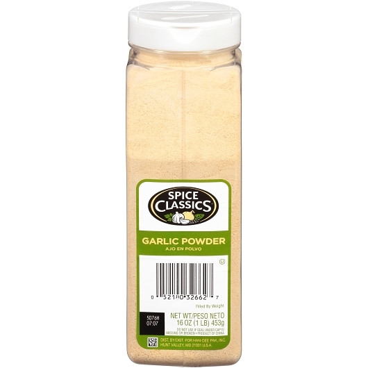 Description Spice Classics Garlic Powder Garlic Powder Garlic powder Good substitute for fresh garlic Ideal for dry rubs, dressings, and marinades OU Kosher certified 1 lb. (0.45 kg) each 6 packs per case The Spice Classics Garlic Powder is a good substitute for fresh garlic ideal for adding to grilled meats, dry rubs, dressings, marinades, and more. It is kosher certified making it suitable for those with special dietary needs. The bulk case with 6 containers of Spice Classics Garlic Powder is a good buy for supermarkets, hypermarkets, and retail stores.