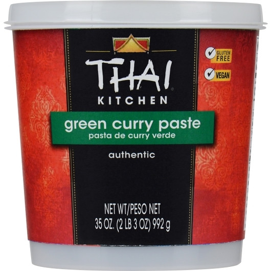 Description Thai Kitchen Green Curry Paste Thai Curry Paste Green curry paste 0 g trans fat 0 mg cholesterol Gluten free Vegan 35 oz. (992.23 g) each 6 tubs per case The Thai Kitchen Green Curry Paste is a blend of lemongrass, green chilies, and spices. This curry paste can also be used as a soup base or as a stir-fry seasoning. The bulk case with 6 tubs of Thai Kitchen Green Curry Paste is ideal for restaurants, diners, and cafes.