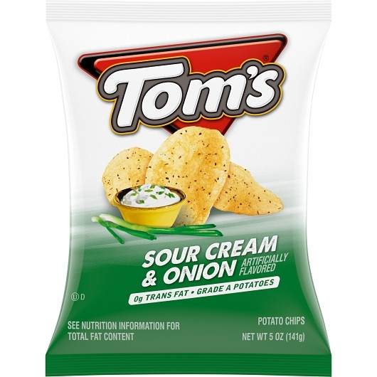 Description Get ready for a big blast of flavor. Behind the crunch of Toms Potato Chips is a hearty punch of sour cream and onion bang. The explosive flavor livens up the thin and crispy crunch of Toms Potato Chips. Anytime is Toms time. Kosher Vegetarian Potato