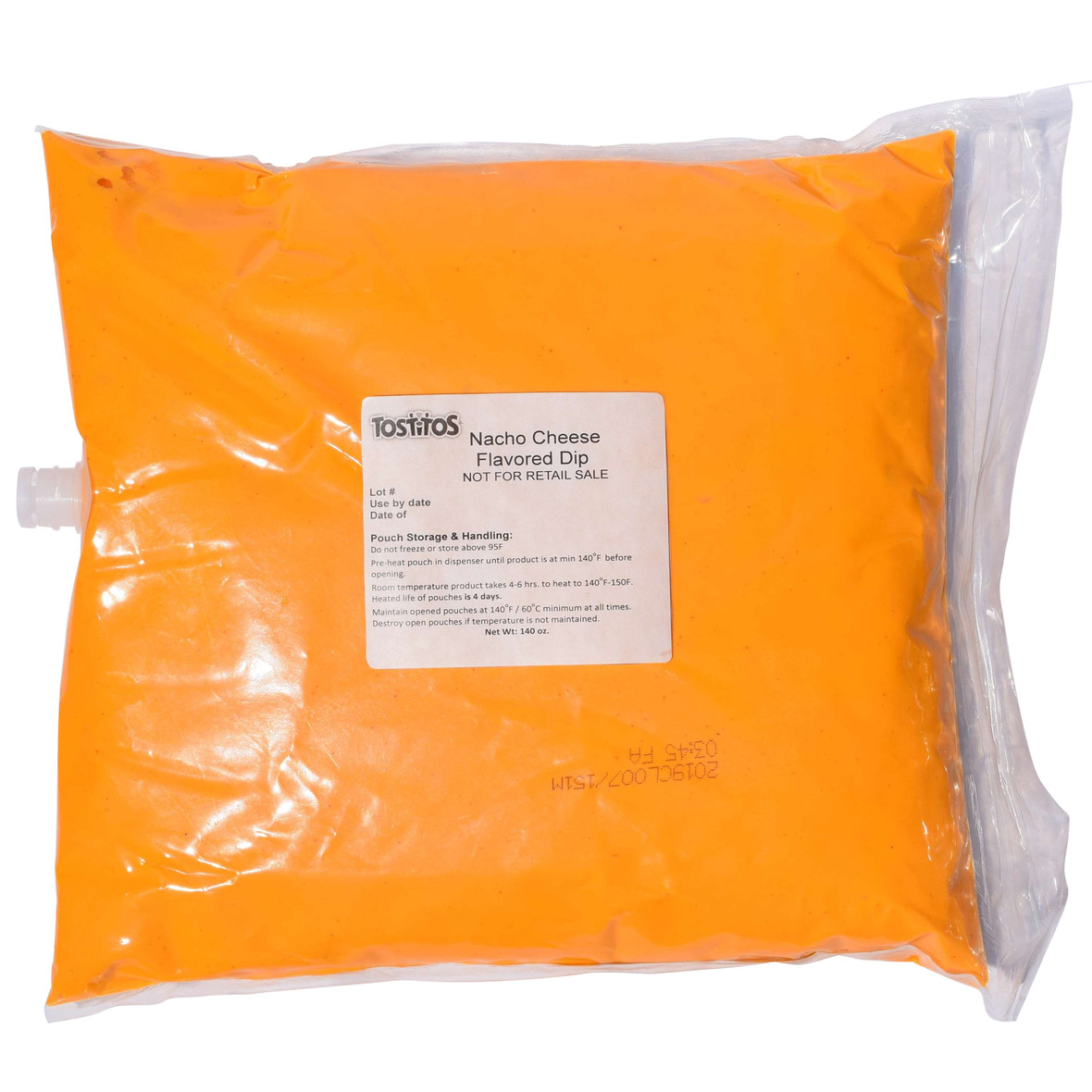 Description Tostitos Nacho Cheese Flavored Dip 140 Ounce, 4 Per Case Tostitos nacho cheese is smooth, cheesy, and delicious and made with the perfect balance of cheddar cheese, mild jalapeno and spices. This cheese sauce is great for simple nachos, especially with Tostitos chips. It’s also great as an appetizer with cheese fries or pretzels. Pouch Storage & Handling: Do not freeze or store above 65F Pre-heat pouch in dispenser until products is at mn 140°F before opening. Room temperature product takes 4-6hrs to heat to 140°F-150F. Heated life of pouches is 4 days. Maintain opened pouches at 140°F/60°F minimum at all times. Destroy open pouches if temperature is not maintained.