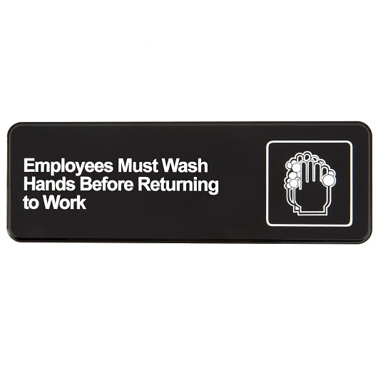 Description Compliance sign Made with plastic Sleek and rounded corner design Comes with an accompanied graphic sign 3 in. x 9 in. (7.62 cm x 22.86 cm) each The Vollrath Traex Employees Must Wash Hands Before Returning to Work White Print on Black Sign can be used to make it clear to employees that hands must be washed before returning to work. With a black background and a contrast white font, this English sign is clearly visible even from a distance. It comes with a pressure-sensitive adhesive on the back, which helps to easily mount this sign on any wall space. This Vollrath Traex white print on black sign will be an ideal choice for restaurants, hotels, healthcare institutions, or bistros. White imprint on Black SIGN, EMPLOYEES MUST WASH 3X9