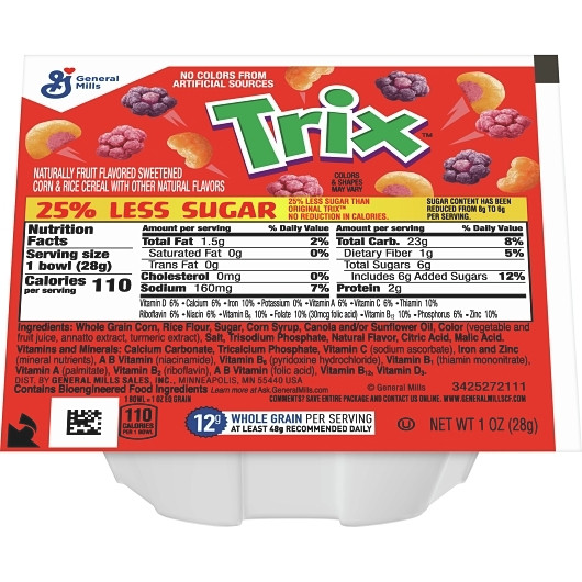 Description The Trix Cereal 25% Less Sugar Single Serve Bowl is a tasty and fun snacking choice. This sweetened fruit flavored corn puff cereal is made using natural color extract from blueberries, purple carrots, and turmeric. Available in a bulk pack of 96 bowls per case, the Trix corn puff cereal is ideal for kids eateries, food stalls and supermarkets. Naturally sweetened fruit flavored corn puff cereal Made of whole grain corn Made without gelatin Contains 25% less sugar No added artificial flavor or color Packaged in a convenient portion control cup OU Kosher certified 1 oz. (28.35 g) each 96 bowls per case