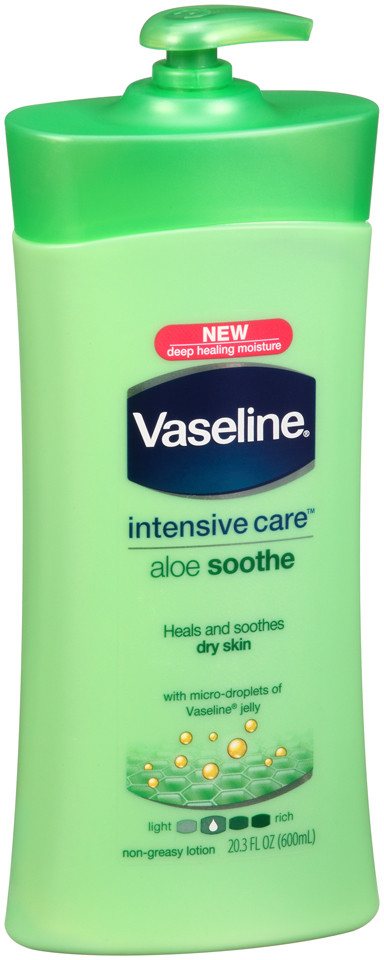 Description The Vaseline Intensive Care Aloe Soothe Body Lotion is formulated with 100% pure aloe vera extract. It refreshes and restores dry skin without making it greasy. Body lotion Restores and refreshes dry skin Ideal for dry skin Formulated with 100% pure aloe vera extract 20.3 oz. (575.5 g) each 4 bottles per case