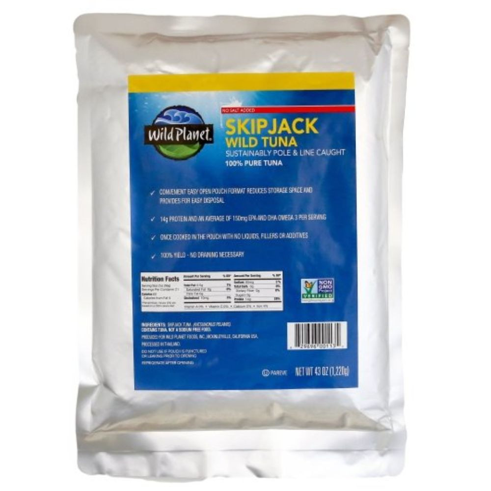 Wild Planet Skipjack No Salt Added Wild Tuna is sustainably caught skipjack tuna packed in its own juices with no salt added. This pure, high-quality tuna provides a clean taste and firm texture. The large 43 oz cans in a case of 6 are designed for high-volume foodservice, restaurants, delis, and retailers seeking premium no-salt tuna.